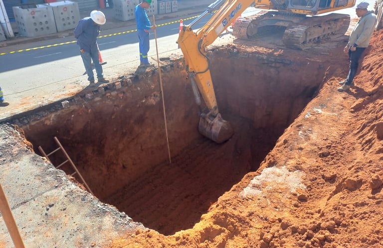Escavação e aterro de valas para instalação de banco de dutos e caixas de passagens para redes de média tensão (MT) e baixa tensão (BT).