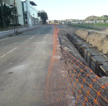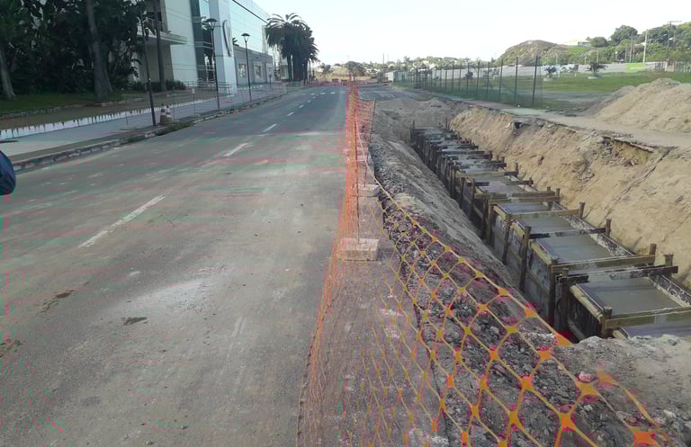 Início das escavações e preparação das valas para a instalação dos bancos de dutos e caixas de passagem para as redes de média tensão (MT) e baixa tensão (BT)